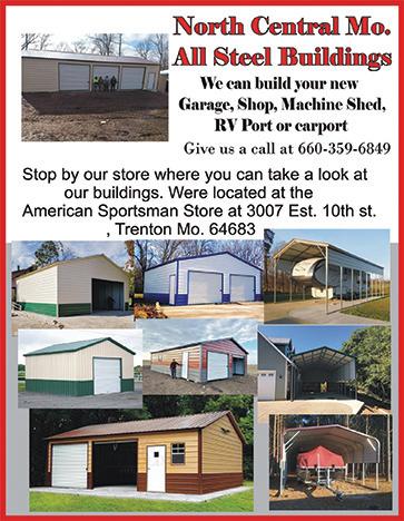 DISPL ADDITIONAL tora y S alit a Qu TIONS: T LAY LOCA uildings ge B a 822 S. Belt Hwy V Park Beacon R St Joseph 660-749-5310 • midw 30008 U.S. Hwy 69 • westminibarns.net Winston, MO 64689 Cameron Regional YMCA 1903 N. Walnut • Cameron, MO 816-632-3811 www.cameronymca.org Check out our customized mobile app 2848 Patee St., St Joseph – Gorgeous newly remodeled, hard to find 5 bedroom, 3 full bath home on a corner lot. $200,000 MLS# 2439566 Call Cassie 454 Lake Viking Ter., Gallatin – Immaculate 3 bed/1 bath home located at Lake Viking with over 144 feet of lake frontage! Sunroom, covered dock, slide, boat & lawn mower, this property has it all. MLS# 2454915 $625,000 Call Dan 1213 Talon Dr., Cameron – Immaculate 3 bed/3 bath home in Eagles Landing Subdivision. Close to schools, parks & golf course. $350,000 MLS# 2446154 Call Dan 150 Crescent Dr., Chillicothe -- Attractive & upgraded 2 bedrooms, 2.5 bath ranch is move-in ready! All new paint, new carpet, and full finished basement. $189,500 MLS #2447441 Call Ray SW 80th St., Chillicothe – Rare opportunity to own land next to Poosey State Forest! 26 & 40ac m/l deer & turkey hunting paradise. $180,000 & $235,000 MLS #2448273 & 2448259 Call Ray PENDING PRICE I IMPROVEEMMEENT P PEENNDDIINNG G State Hwy A & Hamlet St., Princeton – Great building sites w/ utilities, great views and excellent hunting. Call Ray SOLD - 27ac - $151,200 MLS #2438097 SOLD - 50ac - $280,000 MLS #2438109 NEW PRICE - 80ac - $416,000 MLS #2442976 P PEENNDDIINNG G $LOWERED 10,00000 0 THE GREEN HILLS WEEKLY PAPER, TUESDAY, OCTOBER 10, 2023 PAGE 3 Woody’s Outdoor Power Equipment 35 S. Washington, Chillicothe 660-646-7722 • woodys1.com SHELTER STRONG ® G 816-583-2146 (Call or T on, MO 64 Hamilt d . Bir 103 W y Wh Whitne “Highest in Customer Satisfactio in the Central Region” for 4 ou n Among Auto Insurers t of 5 Years in a Row. ShelterInsurance.com/JJDPo / Whitt@ShelterInsurance. W ( JAMESPORT BUILDERS 32137 State Hwy 6 Jamesport, MO 64648 POLE BARNS GARAGES 660-684-6931 JP 660-684-6931 Jamesport Builders ASK BULKABOUTFEED DELIVERY • All Animal Feeds • Animal Health • Gates • Fencing • Feed Bunks • Hay Rings • Stock Tanks 30429 285th St., Gallatin, MO 64640 4 miles east off Hwy 13 on M Hwy 1/2 mile North on 285th St. FOLLOW SIGNS 8am-6pm Monday, Wednesday & Saturday Tuesday, Thursday & Friday by appointment CLOSED Sunday Missouri Days Kick-Off Trenton Area Ministerial liance Annual Soup Supper Thursday, October 19 • 5-7 p.m. First Baptist Church Fellowship Hall 2421 Oklahoma Ave., Trenton Chili - Vegetable Soup - Pie Free Will Donations will be accepted All contributions go toward the Good Samaritan Fund PRINCETON MANOR APARTMENTS is accepting applications for 1 BEDROOM SENIOR CITIZEN APARTMENTS Rent is based on income and includes: Water, Sewer, Trash, Lawn Care, Snow Removal, 24 hour Maintenance and On-Site Laundry Facilities. Applicants may stop by 2610 Princeton Road, Trenton, Missouri to pick up an application and see the pride we take in our housing community. We share in great neighbors, community activities & beautiful surroundings. 660-359-5120 • Some income restrictions apply.