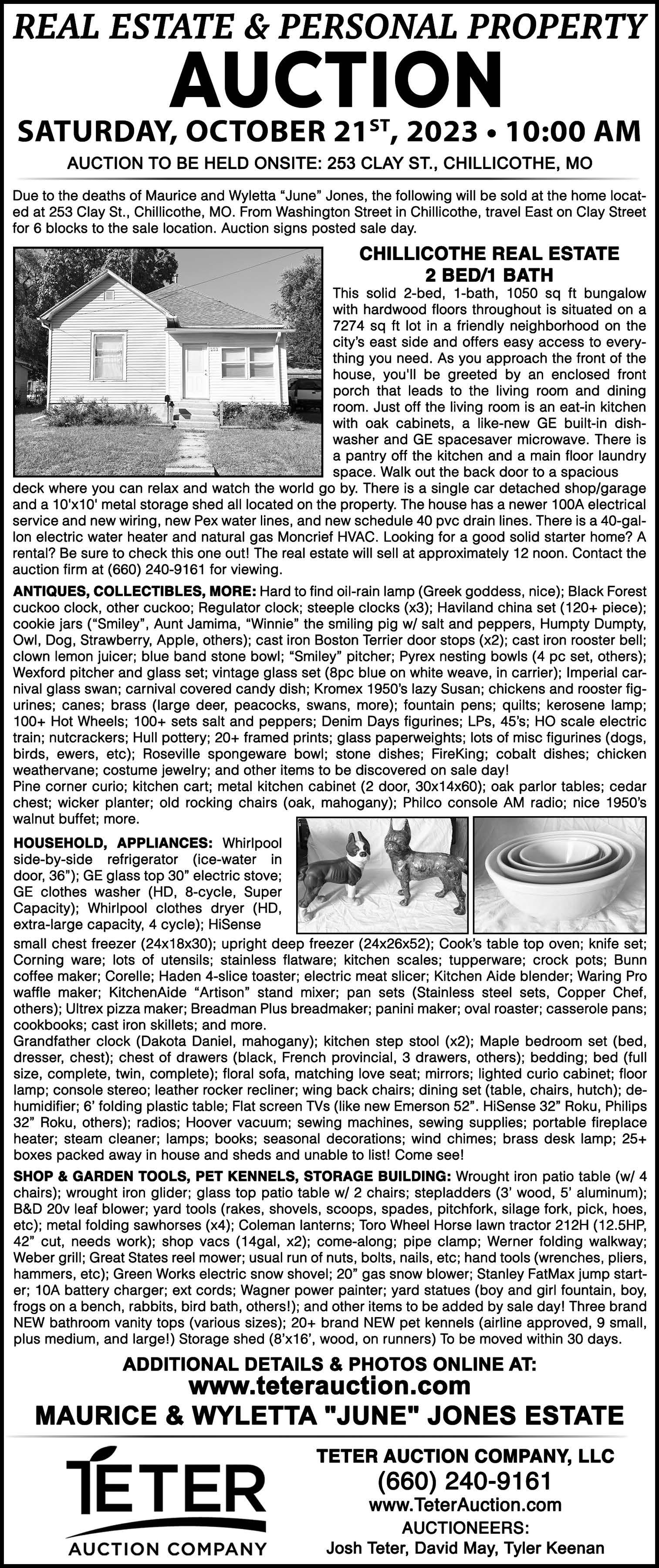 Saturday, October 14 • 10:00 am 3872 East Lowell Street, Amity, Missouri Featuring .8 Acre Property w/Shop in Amity, Missouri Collectibles - Pocket Watches - Gold Coins - Guns Elephant Tusk - Glassware - Household - Tools - Lawn & Garden - Real Estate Sells at NoonTOOLS & SHOP • Overhead Creeper • Engine Hoist • Motor Stand • Parts Washer • 15 gal. Yard Sprayer • 2 -Window Air Conditioners • Cabinets • Retro Table & Chairs • Schaffer Cooler • Jack Stands • Toolbox • Tool Cart • 2 - JD Riding Mowers, need repair • Beer Signs • Coils of Aluminum • Variety ofTools • Table Saw • Chop Saw • Plumbing & Electrical Misc. • Yard Tools • 16 - Tires & Rims, 16" Chevy • Press COINS • 14- Gold Coins including $2.50 Double Eagle, 19111912 $5, $10 dollar; years 1882, 1900, 1908, 1914, 1912, 1911, 1898, 1878, 1915, 1925, 1852, 1906 • Silver Dollars, approx. 15 • Several Half Dollars • Quarters, Dimes and Nickels Flying Eagle Penny • Many More GUNS • 870 Remington Wingmaster • Browning BT99 Trap Guns are Like New COLLECTIBLES & COLLECTIBLE GLASS • 6 - Pocket Watches, 1 - 14kt gold, 1 - keywind • Toy Radio Flyers • Tonka Truck • Hula Doll • Wooden Birdhouse Decoration (small) • 3 -Metal Biscuit Cutters with wooden handles • 5 - Metal Baking Cups • Sad Iron • Cast Iron Tea Kettle • Bronze Mirror with Candle Holders • Ceramic Clock with Book Theme • EAPG Adams Crystal Wedding V-Shaped Glass • Hobknob Small Utility Tray • Large Lot of Salt & Peppers • Green Opalescent Bowl • Feather Milk Glass Pedestal • Vannes Crystal Bowl • Crystal Compote with lid • Anchor Hocking Star Pattern Pitcher • Vintage Glass Ice Bucket with metal handle • Vintage Clear Glass Compote • Corningware Blue Cornflower Coffee Pot • Red Pottery Pitcher • Small Pitcher with fruit designs • Green Vase • Jefferson Vaseline Footed Bowl • 2 -White Hobknob Sugar Bowls w/tray • 2 - Green Bud Vases • Green Bowl • Clear Crystal Bowl • Pink Glass Bowl • Indian Pottery Bowl • Decorative Clear Glass Dish • 6 - Square Dessert Plates with flowers • Antique Candy Dish with metal holder and lid • Fire King Jadeite Lotus Leaf Plate • Antique Butter Mold with cow design • Crystal Glass Tumbler • Red Glass Baskets • Clear Glass Vase • Antique Frosted Bristol Glass Vase, hand painted • Hand Painted Handled Vase • Set of Star Pattern Dishes: 8 dinner plates, 7 salad plates, 1 sugar bowl, 1 serving platter, 1 gravy boat, 8 small bowls, 8 cups and saucers, 1 large serving bowl • Vinegar Jar • Set of 4 Small Plates with Ivy Decoration • Green/Tan Serving Platter • Hunting Dog Figurine • Blue Ceramic Boot • Set of 2 Decorative Doves • Small White Pitcher • 2 - Small Fish Shaped Plates • 8 - Clear Goblets with star decoration • 5 - Large Serving Platters • Decorative Floral Plate • Deep Dish, white • 7 -White Ceramic Plates • Coffee Cup Set, farm scenes • Blue & White Mug • Oblong Crystal Dish • Crystal Sugar Bowl • Clear Fluted Vase • 2 - Clear Glass Roastin' Ear Dishes • German Hand Painted Candy Dish • Clear Round Serving Dish • 6 - Clear Glass Apple Shaped Dishes • China Cup • Crock Serving Bowl • 2 -White Serving Bowls • Small Leaf Dish • Small Flower Dish • 16-point Star Flower Plate • Lady Bug Scrubbie Holder • 2 - Star Candle Holders • Glass Green Bird Ring Holder • Miniature Milk Jug • Clear Apothecary Jar with lid MISCELLANEOUS • Fish Cooker • Insulated Plastic Tea Pot • Embroidered Throw Pillow and Others • 2 - Blankets • 4 - Afghans • Psalm 23 Throw • 2 - Mattress Covers • Assorted Sheets • Crocheted Shawl • 7 - Decorative Lamps • Electric Coffee Percolator • Calculator • Other Miscellaneous CARROLL & KING AUCTION SERVICE Virgil Carroll - 816-288-0677 • Larry King 816-617-2304 Lunch Available on Site Portable Restroom Available Statements made day of auction take precedence over advertising. Not responsible for accidents. Real Estate & Personal Property of Gerald & Diana Estes Personal Property of Norman & Liola Baumgarden