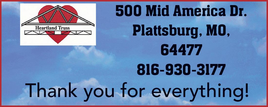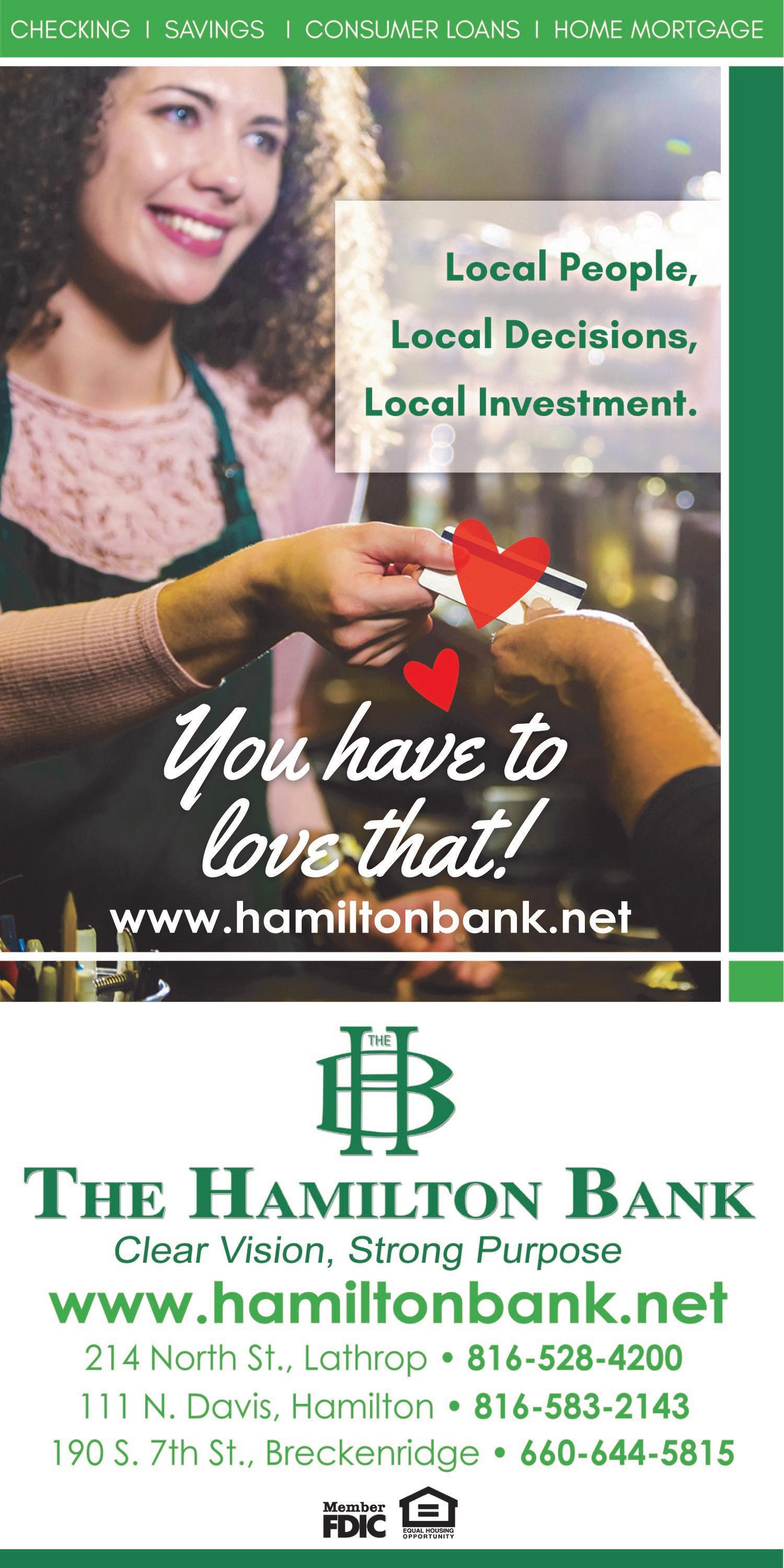 Ray Dockery BROKER/REALTOR 402 E. Evergreen St. Cameron, MO 64429 Cell: (816) 724-1808 Office: (816) 632-1088 raydockery@remax.net www.dockeryproperties.com Trust your important real estate transactions to a full-time Realtor with 48 years of real estate and banking experience! NORTH MISSOURI WEEKLY SPOTLIGHT Trenton My hometown before moving to Cameron 22 yrs. ago. Future Grundy County events and businesses will be featured here. Where would North Missouri be without the growing NCMC, Modine Mfg., Nestle and all the other great Grundy County businesses? Shop locally and tell them thanks! 122 E. 8th Street, Trenton, MO • 660-359-2212 • 102 E. Maple, Plattsburg, MO • 816-539-2111 Published by: Honeycutt Media GREEN HILLS MAIL DELIVERY TO HOMES 24,900 PAPER February 7, 2023 Weekly ECRWSS Standard Postage Paid Plattsburg, MO 64477 Permit No. 6 Postal Customers-Local One ad, one bill, six counties! 64601 Chillicothe 5245 64429 Cameron 4256 64683 Trenton 3838 64465 Lathrop 1789 64640 Gallatin 1621 64477 Plattsburg 1524 64644 Hamilton 1244 64671 Polo 824 64648 Jamesport 798 64624 Braymer 595 64642 Gillman City 369 64474 Osborn 334 64679 Spickard 328 64649 Kidder 320 64650 Kingston 258 64637 Cowgill 258 64493 Turney 242 64689 Winston 237 64641 Galt 228 64620 Altamont 209 64635 Chula 197 64652 Laredo 171 64647 Jameson 135 64646 Humphreys 130 Racks 350 Total 25,500 Dry, Mailed Copies GREEN HILLS PAPER 24,900 Weekly Honeycutt Media Your locally owned media partners DID YOU KNOW? The Agents at Woodward Real Estate are able to assist You in Buying Houses, Land, Commercial Property? Yes, we can Represent You in Finding the Property You Desire Woodward Real Estate Agents, Marilyn Eaton and Angel Stebbins, were requested to be Buyer's Agents. They found this desirable property for their client that was listed by Davidson Real Estate. Limit Your Search Time... Contact the Woodward Real Estate Agents for Immediate Assistance 816-930-2000 • www.woodwardre.com Gallatin, Missouri Kirk Burkhead Ph: 816-288-2209 Fax: 660-663-9615 kirkburkhead@yahoo.com Questions on Medicare?? Call for Appointment 816-288-2209 Medicare Suplement Insurance Life Insurance & Annuities Social Security Claiming