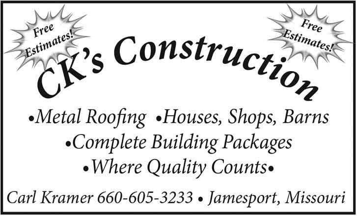 Willing Workers LLPDo you need your siding or roof replaced? Give Willing Workers a call today for a FREE estimate... 660-9735694, John Kramer, 17594 St. Hwy. 190, Jamesport, MO 64648 Tdtf BUY - SELL - TRADEBIG NASTY'S GUNS & AMMO - Stop in and see us at our New Location - 1515 E. 9th Street, Trenton, MO. Nathan Rorebeck, 660-6350469, www.bignastys.com