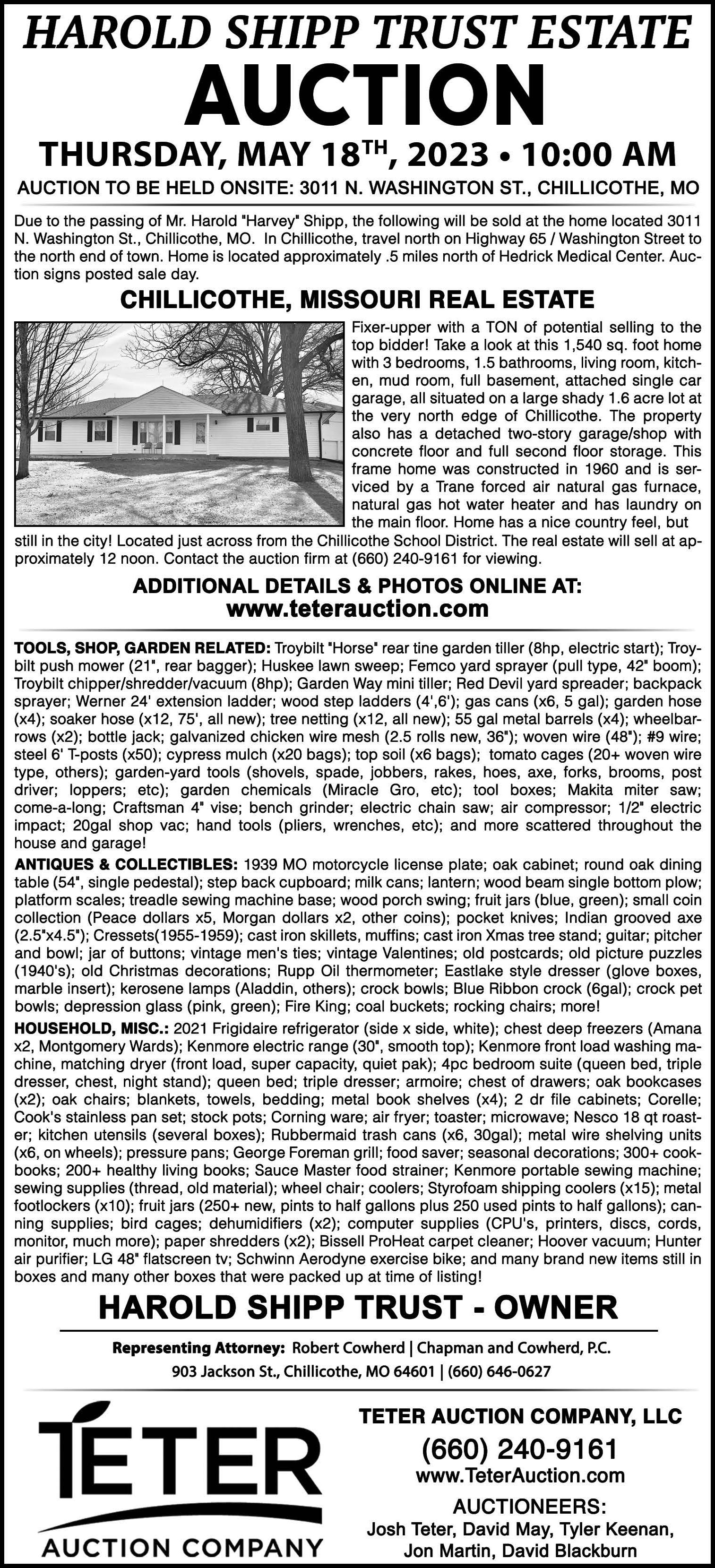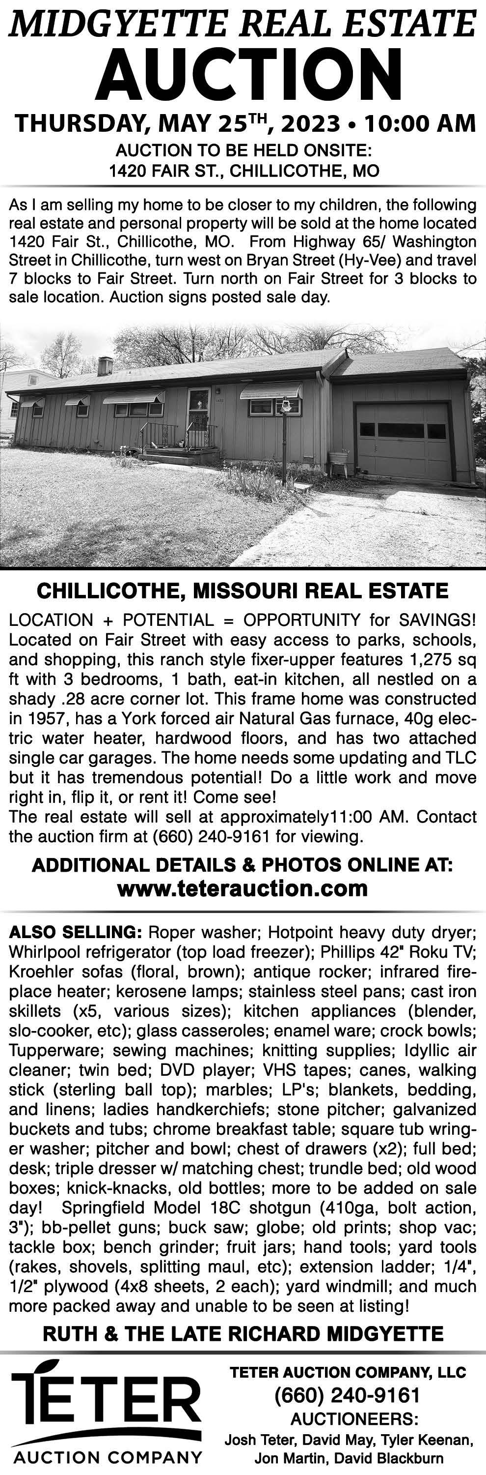 Find us on Facebook at Tina Livestock Market Check out our market report on Cattle Market Mobile! Check us out on our new website: www.tinalivestockmarket.com 435 W. 2nd St., Tina, MO 64682 Casey & Amelia Flinn, Owners Market Report from Monday, May 8 1510 head sold Steers: 300-400lbs 2.75-3.22 400-500lbs 2.70-2.98 500-600lbs 2.65-2.90 600-700lbs 2.20-2.48 Heifers: 300-400lbs 2.35-2.61 400-500lbs 2.20-2.51 500-600lbs 2.15-2.32 600-700lbs 2.05-2.22 Bulk of butcher cows 84-99 High Yielding 99-106 Bulls 115-129 Cattle Sales: Mondays @ 11 am Sheep, Goat & Hog Sales: 1st & 3rd Saturdays of the month @ 10 am Special Cow Sales: 4th Friday of the month @ 6 pm 5 weigh cow buyers at every sale! Very active weigh cow and bull market! RUSSELL LIVESTOCK MARKET 31683 US Hwy. 34, Russell, IA 50238 • Barn Phone (641) 535-6065 Weigh Cows - 9:00 am • Feeders - 11:00 am ** SPECIAL CATTLE SALE ** MOndAy, MAy 22, 2023 ** CATTLE SALE ** MOndAy, MAy 29, 2023 BARn WILL BE OPEn SUndAyS 8 AM - 8 PM WATCh OUR AUCTIOn LIvE @ www. dv auctio n .com visit www.russelllivestockmarket.com • Barn: (641) 535-6065 Owners: Tony & Meshara Ballanger 641-777-3113 - Cell Owners: Shawn & Jana Murphy 641-777-0103 - Cell Field Rep: Justen Murphy 641-217-1235 - Cell Field Rep: Brian Mitchell 515-360-1486 - Cell Field Rep: Tim Rinehart 660-425-0991 - Cell Field Rep: Aaron McGee 641-203-3043 - Cell O’Hare Real Estate: 60’x100’ Insulated Morton Shop Building w/ 4-bedroom, 1 bath living quarters measuring approximately 2,000 sq. feet & 4,000 sq. feet of heated & cooled shop sitting on 1.5 acres w/ security fence. Open floor plan w/ kitchen, large family room w/ ventless fireplace, laundry room. Newer range/oven, like new natural gas furnaces and ac unit. Two car attached garage and loading dock making this shop/home a perfect business opportunity. This building/property was formally an antique mall and is easily accessible to once again be a small business in Pattonsburg, MO! Forsythe-Porter Real Estate: 1. Property Location: 1563 Lake Viking Terrace; Gallatin, MO: Location! Location! “A-Frame” Style Home sitting on two-large second tier lots with a beautiful view of Lake Viking. 864 sq. feet home w/ 1 bedroom, 1 bath, living/dining room & laundry on the main floor. Loft and half-bath upstairs. Detached 720 sq. foot garage/workshop. This home is a project but would make a perfect investment property or keep it for your weekend getaway! 2. Property Location: Lake Viking Airport: Lot S164 30’x40’ Hangar/Storage Building, 14-foot eves, large slider doors and concrete floor (no electricity). If you are looking for storage at Lake Viking, here is a golden opportunity! Some contents sell with both properties. Contact Jumps Auctions @ 660-605-0860 to view the property. Personal Property: Furniture – Household – Antiques – Collectibles Vehicles – Lawn & Garden – Tools See Pics & Complete Sale Bill @ www.shomemoreauctions.com or Jumps Auctions Facebook Carol O’Hare Auction and Diane Forsythe & late Don Porter Auction SALE CONDUCTED BY: JUMPS AUCTIONS AUCTIONEER: RUSTIN JUMPS: 660-605-0860 www.shomemoreauctions.com DIRECTIONS: From Interstate 35 Exit 78. Go west on Hwy C four tenths mile. Go north of gas station on 162nd St. to sale site. Watch for Sale Signs. • ADVANCE NOTICE • REAL ESTATE & PERSONAL PROPERTY AUCTION Saturday, June 3, 2023 • 10:00 A.M. SALE LOCATION: 13787 162ND STREET, PATTONSBURG, MO 64670 AUCTIONEER’S NOTE We are combining two auctions into one. There will be a nice offering of personal property along with the real estate and vehicles which will be selling at Noon. TERMS: Cash or check w/ proper I.D. Not responsible for accidents, thefts or errors in advertising. Announcements made day of auction take precedence over all advertisements. UPCOMING SALE DATES May 22, 2023 - Noon Special Sheep & Goat Sale --------------------------Sale Order: Feeders, Breeding Cows & Bulls, Followed by Slaughter Cows & Bulls --------------------------Check us out on Facebook at: North Missouri Livestock Auction, LLC NORTH MISSOURI LIVESTOCK AUCTION, LLC. 52762 Bus Hwy 5, Milan, MO 63556 Paul & Deanna Eitel, Owners Barn: 660-265-4286 CONTACTS: Paul Eitel 660-265-6404 Mike Edmundson 660-358-2010 Auctioneer: Doug Bige 641-895-8985