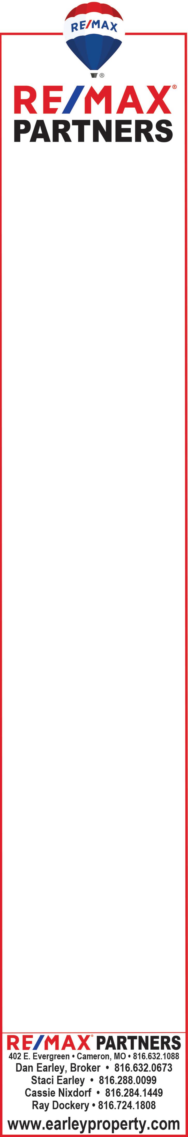 All types of Skid Loader work Call Gabe Buzzard Trenton, MO 816-678-3918 CRP/Pasture Clearing Fresh Donuts every Saturday 103 S. Locust, Jamesport, MO 64648 Professional, Personalized Grooming APPOINTMENTS AVAILABLE MONDAY - SATURDAY 35 years of experience! SHELLY’S PET CARE 660-684-6864 Serving the Green Hills Area Since 1996! Call MIDWEST MECHANICAL and Rely on Comfort MIDWEST MECHANICAL Brian S. Israel, Owner Over 25 Years Experience OTR Drivers Needed FULL- & PART-TIME AVAILABLE HOME ON WEEKENDS Sign-on Bonus 660-752-3228 2848 Patee St., St Joseph – Gorgeous newly remodeled, hard to find 5 bedroom, 3 full bath home on a corner lot. $200,000 MLS# 2439566 Call Cassie 1006 Sam G Hiner Dr., Cameron – Move-in ready 3 bed/2 bath raised ranch. Huge fenced back yard with storage shed. $239,900 MLS# 2441471 Call Dan 1708 Bluestem Cir., Cameron – Lovely 3 bedroom/3 bath home ready to move in! Large fenced yard with mature trees, small shed. Two tiered covered deck with patio and hot tub. Finished basement. $239,900 MLS# 2443440 Call Dan PRICE I IMPROVEEMMEENT PENDING 1213 Talon Dr., Cameron – Immaculate 3 bed/3 bath home in Eagles Landing Subdivision. Close to schools, parks & golf course. $375,000 MLS# 2446154 Call Dan State Hwy A & Hamlet St., Princeton – Great building sites w/ utilities, great views and excellent hunting. Call Ray 27ac - $151,200 MLS #2438097 50ac - $280,000 MLS #2438109 80ac - $440,000 MLS #2442976 813 NE 48th Ave., Spickard – 40.92 acres of unlimited potential. Perfect site for hunting, recreation, or building a custom home. 3 acre pond. $225,060 MLS# 2428775 Call Ray P PEENNDDIINNG G