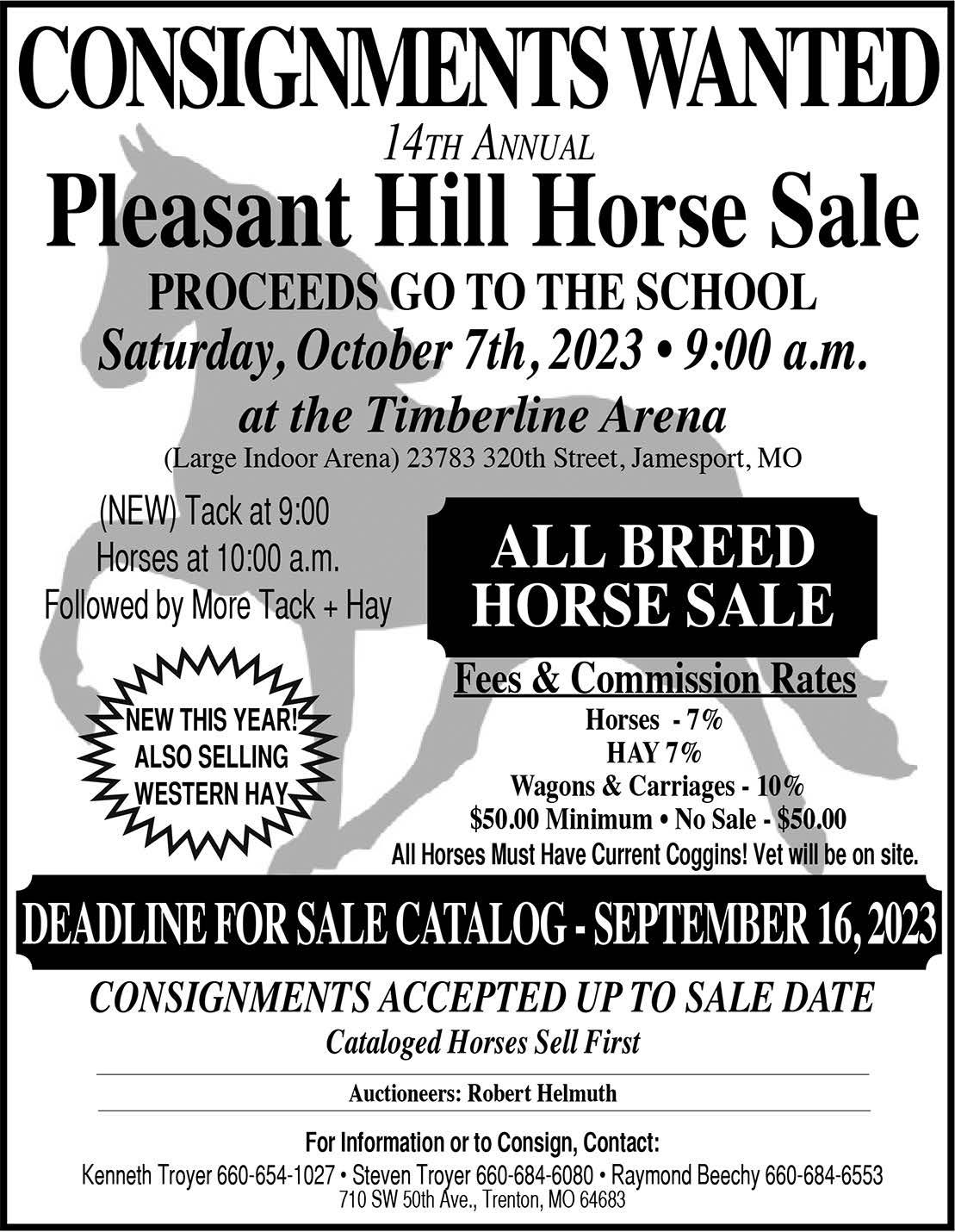 THE GREEN HILLS WEEKLY PAPER, TUESDAY, AUGUST 15, 2023 PAGE 11 Truck-Tractors-Machinery-Equipment: 1994 Chevy Silverado 3500, 4wd, 260k miles w/ 9k miles on motor (needs brakes); AC7000 Allis Chalmers (runs-needs work); McCormick Farmall 560 Gas (runs-needs brakes); 2011 Open Range Livestock Trailer, 6’X16’, 3,500# axles; JD 1209 Haybine (been sitting a few years); McCormick Grain Drill-10’ (needs tires); Swisher 44” ATV Pull-Type Brush Mower (needs work); New Holland 56 Hay Rake; 3 pt. Bale Spike; 3 pt. Bale Forks; 5’X10’ Utility Trailer; 6’x16’ Utility Trailer w/ gate; 6 Bale Bumper Hitch Hay Trailer; ATV Drag Harrow; Land Pride 6’ 3 pt. Landscape Rake; ATV Snow Blade; Farm Star Post Hole Digger w/ 12” Auger Bit; Hay Wagon; JD Horse Drawn 2-Row Planter Tools-Livestock Equipment-Fencing-Gates-Lawn/Garden: Industrial Air 60 Gal Air Compressor-Oil Bath, Single Stage; JD HR-G1700i Generator Inverter; JD LA 150 Auto Riding Mower, 54” Deck; JD LA 120 Riding Mower 42”; Husqvarna 350 Chainsaw; Shindaiwa Chainsaw; Green Works 24V Pole Saw; Electric Tiller; Electric Branding Irons; 2-Power Pak (need batteries); Large Shop Fan; Shop Light; Heat Lamps; Kerosene Heater, new in box; Air Bubble; Transfer Pump; Jack Stands; Hand and Power Tools; Wrenches; Sockets; Hardware Sorters; 2-Plastic Truck Tool Boxes; Blitzer Electric Fencer; Barbed Wire; 2-Rolls Red Brand Woven Wire-new; Fencing Supplies; Steel Posts; Post Puller; 4 Hedge Posts; Cattle Squeeze Chute; Approx. 50-Portable Corral Panels; 10’, 12’, 16’(some Preifert); Walk-Thru Bow Gates; Assorted Tubing Pasture Gates; Wire Cattle Panels; 3-Bale Rings; Sheep & Goat Feeders; Metal Cattle Feed Bunks; Feed Tubs & Waters; 500 gal Water Tank; 1,000 gal Stock Tank; 2-Round End Stock Tanks; Poly Stock Tank; 3-Western Saddles; English Saddle; Horse Tack; 6’ Aluminum Ladder; 7’ Werner Al. Ladder; Fiberglass Ext Ladder; Receiver Hitch Rack; P215/65R17 Goodyear Tires & Rims off Dodge Charger; Aluminum ATV Ramps; Pull Type Lawn Fertilizer Cart; Yard Roller; Antique Garden Cultivator; Old Push Mowers & Tillers, not running; Garden Planter; Flower Pots; Hose Reel; Garden Hose; Garden Tools; Grease Guns; Gas Cans; Charcoal Grill; Wrought Iron Patio Table & Chairs; Porch Bench; Hudson Hand Well Pump; Metal Shelves; Coolers; Lawn Décor; Assorted Lumber; Assorted Scrap Metal & More Guns-Ammo-Hunting-Outdoor:Winchester Model 74 .22 LR Semi Auto; Winchester Model 70 .243 Bolt Action, Gander Mtn. Scope; Remington 700 25-06, Bolt Action, Charles Daily Scope; Ithaca Model 37 16 ga. Shotgun, 2 ¾” Chamber, Full Choke; Daisy BB Gun; Ammo & Brass; 8- Gun Metal Cabinet; Bear Compound Bow & Case; Tree Stand Ladder; Hunting Vests; Deer & Turkey Calls; Assortment of Critter Traps; Fishing Tackle; Ear Protectors; CB & Ham Radio Equipment Furniture-Household-Antiques-Collectibles: 30,000 BTU Blue Flame Mr. Heater; Frigidaire Upright Freezer; Frigidaire Window A/C; Whirlpool Washer & Dryer; Kitchen Table; Oster Convection Oven; Whirlpool Electric Oven; GE Roaster Pan; Tupperware; Vision Ware Cooking Set; Assorted Glassware; Coffee Cups; Soup Pot w/ Cups; 3 pc. Bedroom Set; Armoire; Hide-a-Bed Couch; Coffee Table & End Table; Magazine Rack; 2 Door Cabinet; Record Cabinet; White Elna Sewing Machine; Plant & Decorative Stands; Bow Flex Exerciser; Panasonic Camcorder; Pentex & Cannon 35mm Cameras; New Ceiling Fans w/ Lights; New Vanity Light; Hardwood Flooring; Pictures & Décor; Books, Inspirational, Reader’s Digest, Children’s & More See Pics & Complete Sale Bill @ www.shomemoreauctions.com or Jumps Auctions Facebook Debbie Deems and Kenneth & Arlene Bell Auction SALE CONDUCTED BY: JUMPS AUCTIONS AUCTIONEER: RUSTIN JUMPS: 660-605-0860 www.shomemoreauctions.com TERMS: Cash or check w/ proper I.D. Not responsible for accidents, thefts or errors in advertising. Announcements made day of auction take precedence over all advertisements. DIRECTIONS: Travel 4 miles south of Gallatin on Highway 13 to State Road HH. Go west on HH 3 ½ miles to 210th St. gravel road, turning south, travel approximately 2 ½ miles to auction site. From Hamilton, take Hwy CC 4 ½ miles to Yale Avenue gravel road. Go east on Yale one mile to 210th St. turning north, travel 1 ½ miles to auction site. Watch for Sale Signs. AUCTIONEER’S NOTE: The farm has been sold and Debbie, along with her folks (married over 67 years) are moving to town. They will be offering farm/livestock equipment, tools, guns, household and more at auction. Guns and Machinery will sell at Noo n! FARM & PERSONAL PROPERTY AUCTION Saturday, August 26, 2023 • 9:30 A.M. SALE LOCATION: 31525 210TH STREET, HAMILTON, MO 64644 MU Extension Has a New Home The Clinton County University of Missouri Extension office has moved to 100 Y Highway in Plattsburg, one block north of 116 Highway. It offers the same great services: *Youth Programs, 4-H *Soil sample tests *Master Gardening classes *Access to horticulture and agronomic specialists *Animal agriculture information *Health, wellness and nutrition classes