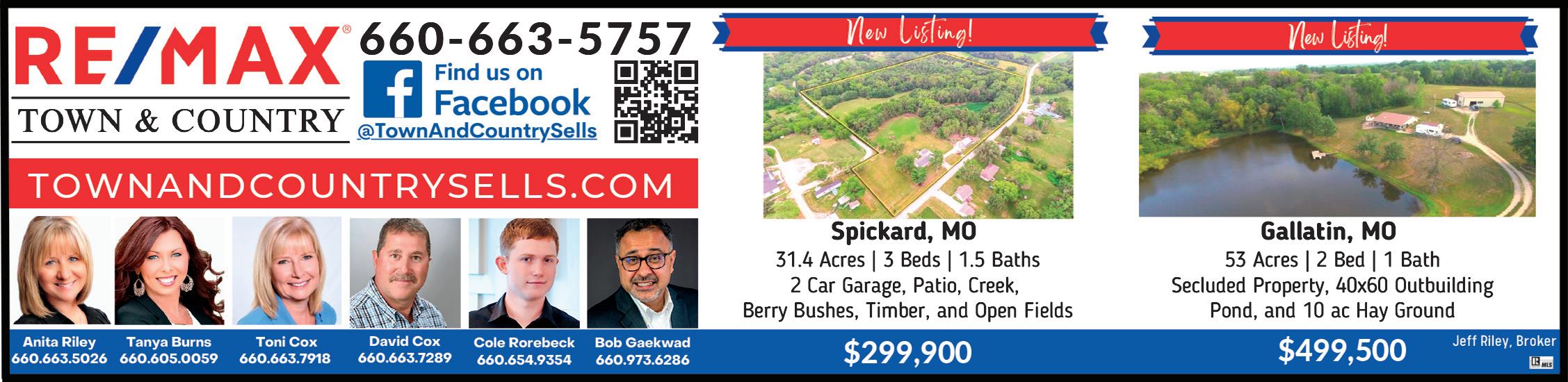 New Listings! - Rare opportunity to own land next to Poosey State Forest! 26 & 40A m/l deer and turkey hunting paradise! Food plots, elevated blinds and more! Dream spots for your weekend retreat cabin! Call or see my website today! 816-724-1808 122 E. 8th Street, Trenton, MO • 660-359-2212 • 102 E. Maple, Plattsburg, MO • 816-539-2111 Published by: Honeycutt Media GREEN HILLS MAIL DELIVERY TO HOMES 24,900 PAPER August 22, 2023 Weekly ECRWSS Standard Postage Paid Plattsburg, MO 64477 Permit No. 6 Postal Customers-Local One ad, one bill, six counties! 64601 Chillicothe 5245 64429 Cameron 4256 64683 Trenton 3838 64465 Lathrop 1789 64640 Gallatin 1621 64477 Plattsburg 1524 64644 Hamilton 1244 64671 Polo 824 64648 Jamesport 798 64624 Braymer 595 64642 Gillman City 369 64474 Osborn 334 64679 Spickard 328 64649 Kidder 320 64650 Kingston 258 64637 Cowgill 258 64493 Turney 242 64689 Winston 237 64641 Galt 228 64620 Altamont 209 64635 Chula 197 64652 Laredo 171 64647 Jameson 135 64646 Humphreys 130 Racks 350 Total 25,500 Dry, Mailed Copies GREEN HILLS PAPER 24,900 Weekly Honeycutt Media Your locally owned media partners North of Gallatin Contact Megan Graham at 913-547-4275 or sales@republican-times.com ****************** South of Gallatin Contact Becca Giesken at 816-284-0885 or becca@clintoncountyleader.com Bannad Studios Custom Decor Made Easy @bannadstudios Because Quality Counts We do: • Cushions • Curtains • Pillows Bannad Studios specializes in Outdoor Seating and Entertainment Areas. Call 816-288-9660 to get a quote today! THINKING ABOUT A MOVE? Wall of Windows allows Amazing Views of Pond, Wildlife and Seasons Change Live on one floor, Living Area, Kitchen, Dining, Bedrooms Morton Building and Outbuildings include Multiple uses with Water & Electricity 58 Acres to Enjoy, Farm, and Entertain. Don't Hesitate! Take Advantage of this Rare Opportunity Call Cole Kemper and Make an Appointment Today! 816-930-2000 • www.woodwardre.com