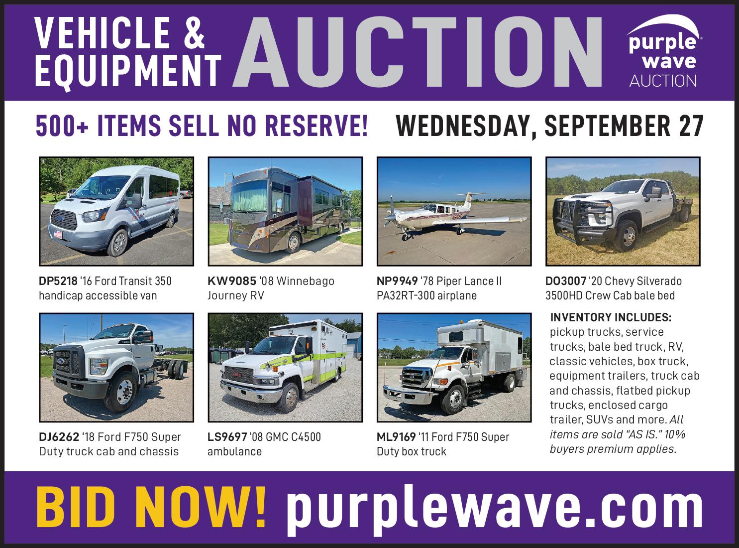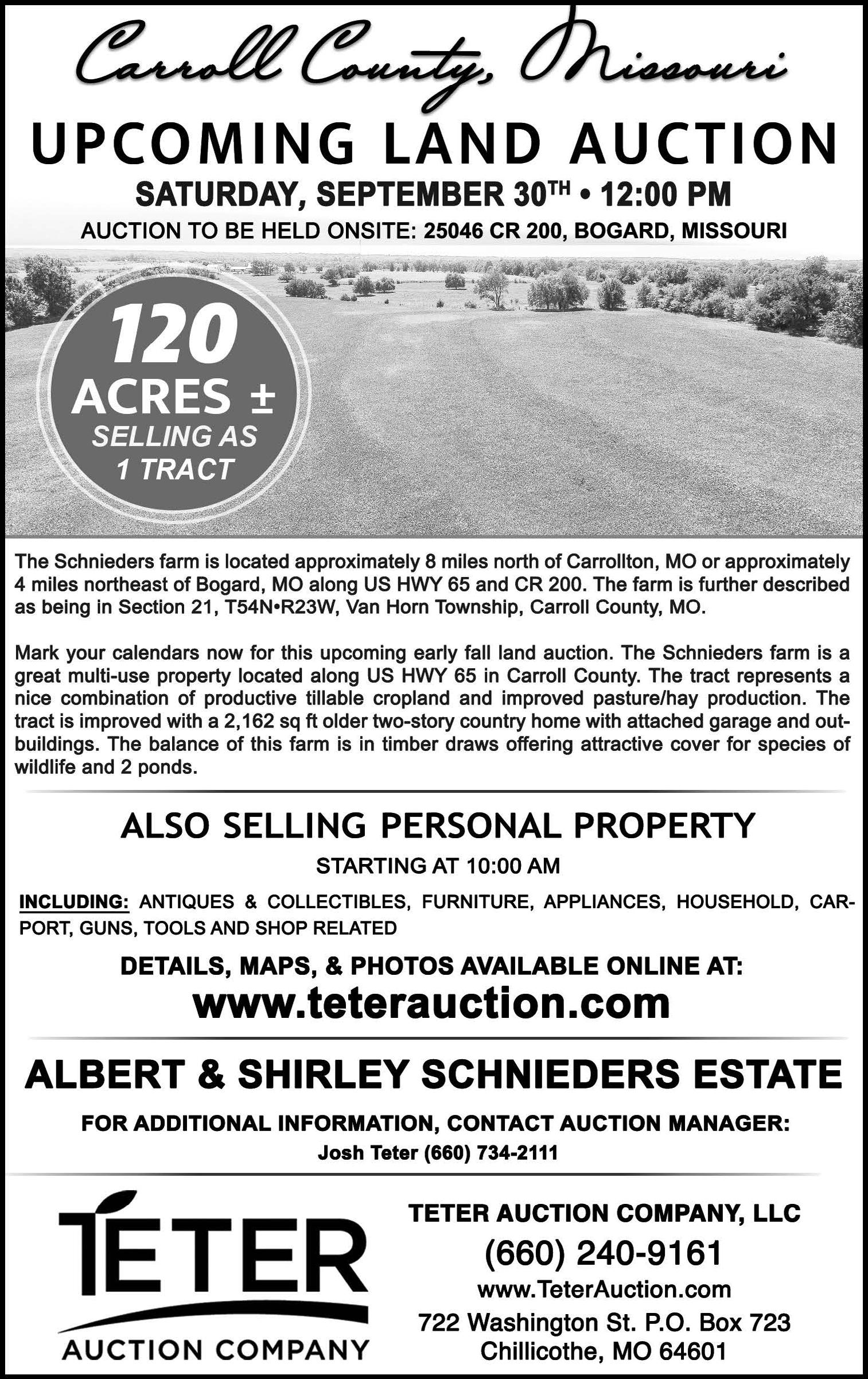 WANTED FOR UPCOMING AUCTION If you want to get your items advertised early call Larry Offutt Auction 816-724-3214 To be held at Cameron Community Building Sat., October 21 • 1pm We will sell firearms, household, lawn & garden, trucks, trailers, pick ups, antiques, farm equipment, miscellaneous PARTIAL LIST 773 Bobcat Skid-steer w/tooth bucket - attachments sold separately include back hoe attachment w/16” bucket, EZ PUller tree sheer, 2 prong Bale Spike, 3 pt 6’ Roto tiller 1999 Silverado LS 2500 HD 4x4 - HD 4 speed auto transmission, 191,650 miles 2012 Chevrolet Impala, sharp appearance, 143,000 miles 2008 Polaris Sportsman 450, 4x4 ATV 20’ GN Livestock Trailer Allis Chalmers D-17, W.F. gas tractor w/3pt hitch Several Farm Trailers Calf catching cage for ATV Electric Hydraulic 5th wheel ball attachment bale spike Other machinery - Shop & Farm Related Items RICK & GAYLE DESHON FARM AUCTION We have sold our farm - Will hold Auction from Highway 69 in old Pattonsburg, MO go west on Route Z a short distance, then north on Route PP to 14397 Route PP, Pattonsburg, MO - SIGNS POSTED SAT. SEPT. 23 • 10 A.M. Nice Auction – Attend On Time – Food Served TERMS: Cash or Valid Check. Not Responsible for Accidents, Thefts or Errors in Advertising. Announcements made at auction take Precedence over printed ads. SPECIAL COW SALE FRIDAY, SEPTEMBER 22 • 6 PM EXPECTING 300-400 HEAD! Check our Website or Facebook for Sale Listings! Open all day on Sundays to receive livestock! Barn: 660-622-4214