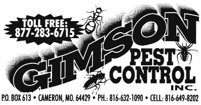 error in advertising. Statements made day of sale take precedence over printed material. We have the right to refuse bids and/or bidder. * Lunch Served on Site * Public Auction - Gilman City, MO Property of the late Lyle Harrison Saturday, Sept. 30, 2023 9:00 A.M. 33291 E 320th Pl • Gilman City, MO 64642 Hwy 136 to Hwy CC South approx 3 miles to 320th Pl go East Watch for signs day of sale ALLEN AUCTION SERVICE Princeton, MO • Cell (660) 953-0346 Auctioneers: Jerry Allen, Ryder Allen, Bob Peniston, Trent Peniston, Trevor Peniston Full listing on web w/pictures: www.auctionzip.com ID#38454 or www.shomemoreauctions.com Page Tree Service Specializing in Tree Trimming Stump Grinding Complete Removals •75 ft. Bucket Truck •Chipper & Stump Grinder Jeff Page Shop: 660-359-3699 Home: 660-359-2202 Serving the entire Green Hills Area!! Licensed & Insured Free Estimates 32596 July Ave • Jamesport, MO 64648 North of Jamesport on July Ave., Just West of 6 Hwy Livestock Processing Deer Processing Summer Sausage Retail Meats in House Local Farm-Raised Products v.m. Live Beef and Pork Available Inspected Facility OTR Drivers Needed FULL- & PART-TIME AVAILABLE HOME ON WEEKENDS Sign-on Bonus 660-752-3228 FOR RENT Sunnyview Apartments is taking applications for single & double apartments. Sunnyview is a residential care facility for the elderly. We provide qualified staff to administer medications, provide three meals a day and offer minimal assistance with the activities of daily living. Now accepting Medicaid. For more information contact Cassandra Brewer at 660359-5647. For Rent: Mobile home in Jameson. 3 bedroom and 2 bath. Call for application. 660-334-1334 FOR SALE 2007 Chevy Blazer. Arizona owned, no rust. 150,000 miles. In great shape, runs great. Need to sell. $5,000 OBO. Gilman City. 520-850-4448 or 520465-1739 Water pumps, Delta faucets, plastic pipes & fittings, copper tubing. A complete line of plumbing supplies