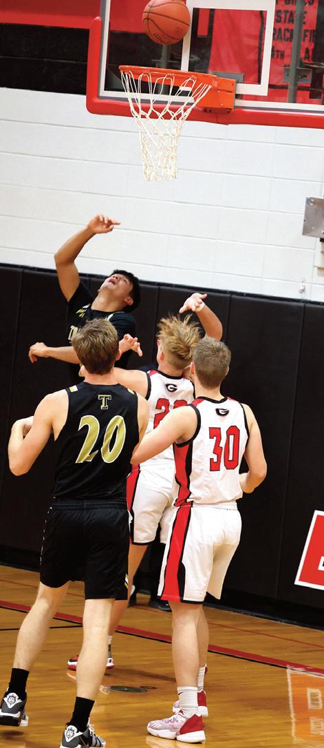 (top right) S. Doolittle looked to tap one off the glass but was fouled by L. Shubert. Doolittle was fifty percent from the free throw line. Shubert scored some base line threes for Gallatin.