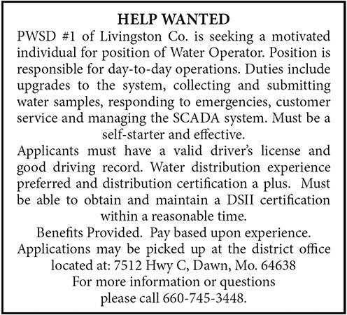 Notice is hereby given that Linn-Livingston Public Water Supply District #3 will open filing for the purpose of electing two board members, one from Sub-District #2 and one Sub-District #3 for a term of three years. The opening date for a candidate to file is December 6, 2022, at 8:00 am. The closing date for a candidate to file is December 27, 2022, at 5:00 pm. Persons who wish to file as a candidate for the board of directors for the Municipal Election on April 4, 2023, can do so by applying in person at the Water Office at 701 South State Street in Wheeling, MO. dDec1