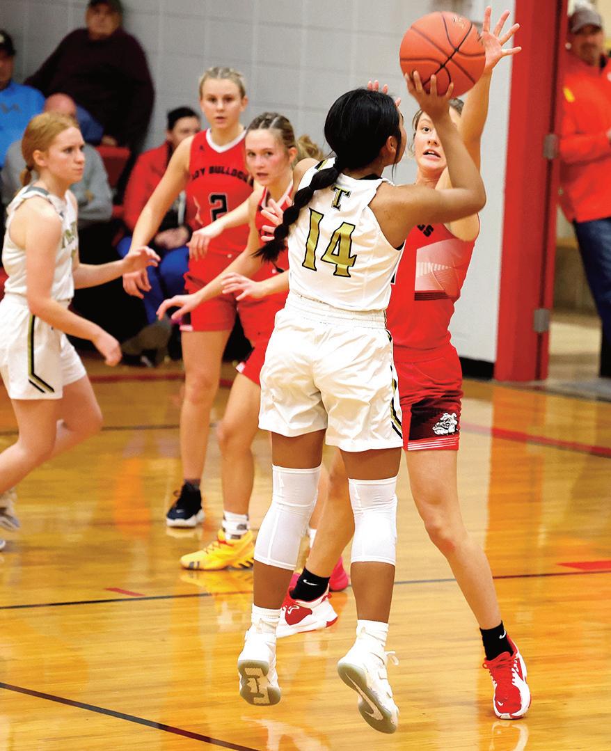 SHOOTER - (left) A. Soriano goes up for two against A. Ball. Soriano had two big 3-pointers for Trenton as well as passed the ball with speed. A. Ball was a huge rebounder for Gallatin.
