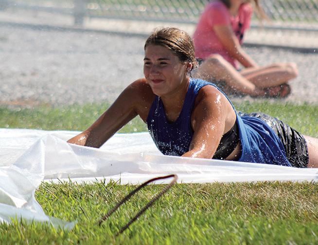R-T Photos/Libby Endicott GETTING DOWN - (above) Emma Roberts and (below) Madi Moore work on their diving skills during the teams slip and slide fun. The team enjoyed the cool water after a hot couple hours of hard work
