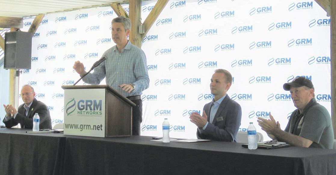 Rural Utilities Service (standing at podium), spoke to the crowd gathered at Mt. Moriah during the GRM Networks Fiber Field Day held Thursday, August 31. Other speakers included, from left, Josh Seidemann, Vice President of Policy and Industry Innovation, NTCA – The Rural Broadband Association; Mitchell Bailey, GRM Networks CEO; and Danny Busick, Missouri District 3 State Representative.