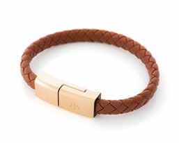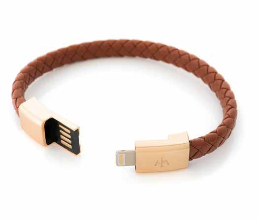 Micro-USB to USB bracelet style charging cable. Tan braided PU. Gold plated hardware.