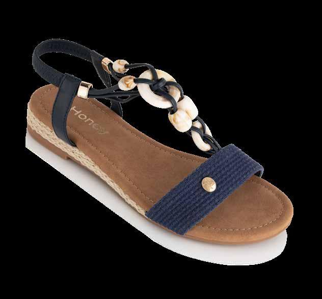 Navy PU and woven fabric sandal. Marbled synthetic bead detail. Elasticated PU ankle strap. Braided jute wedge trim.