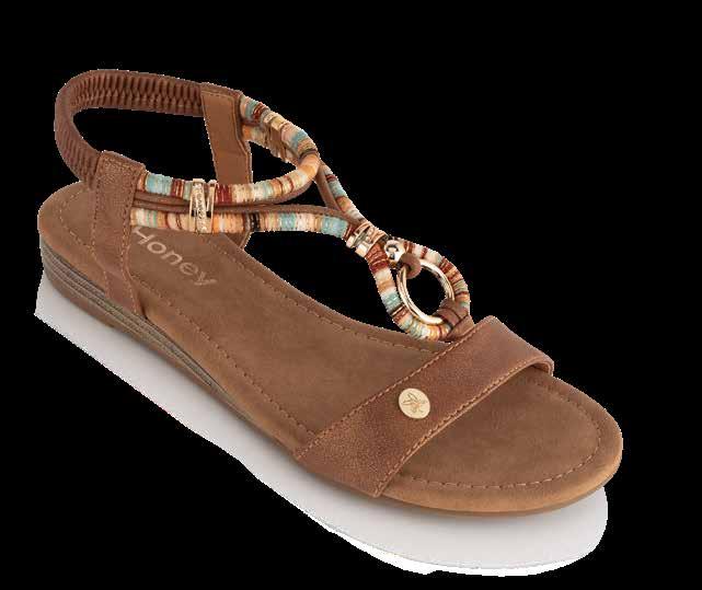 Metallic finish tan PU sandal. Blue and orange tonal chord detail. Rose gold synthetic beads. Elasticated PU ankle strap.