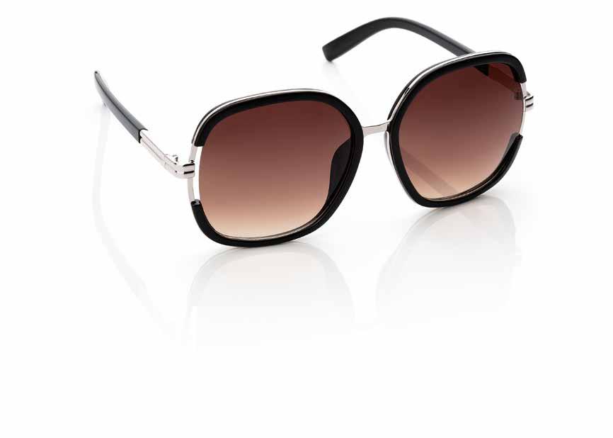 Rhodium plated metal frame. Black polycarbonate detail. Rhodium plated temples. Black polycarbonate tips. Brown gradient lenses. Protective hard case 145mm wide.