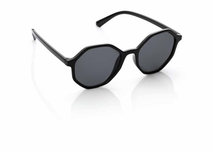 Black polycarbonate frame. Gold plated temple detail with silver glitter effect. Matching polycarbonate temples and tips. Solid smoke lenses. Protective hard case. 145mm.