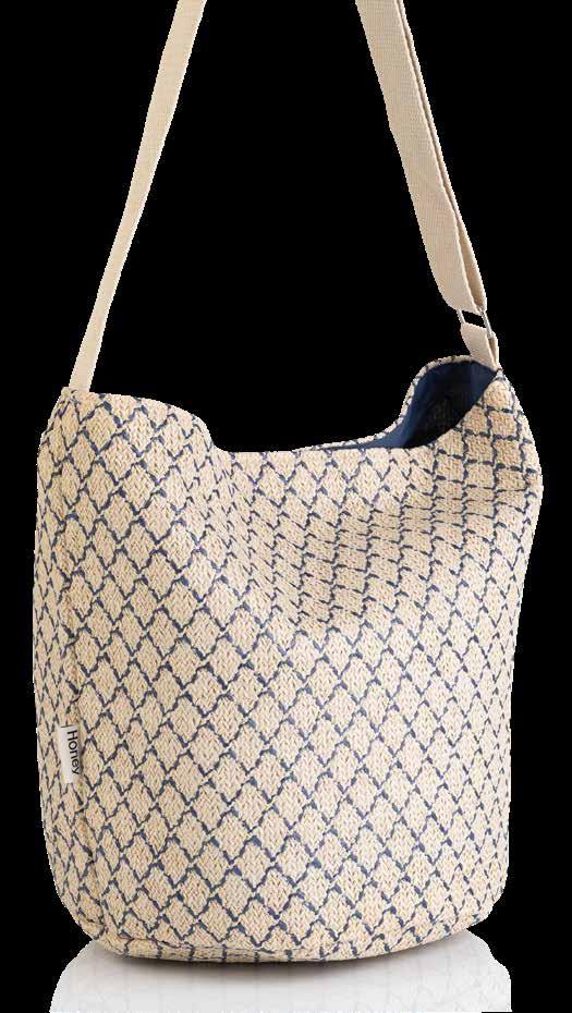 Neutral and indigo paper straw woven bucket bag. Magnetic clip closure. Fully lined. Woven cotton shoulder strap. Shoulder strap: 60cm extends to 118cm.