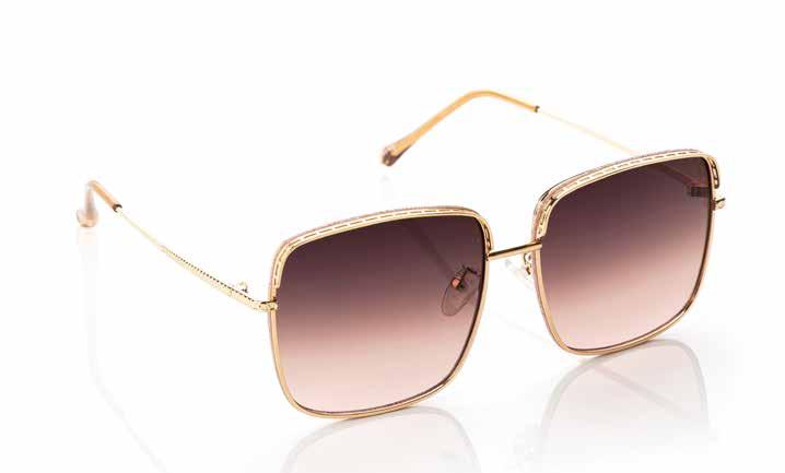 Gold plated metal frame with pink glitter effect detail. Gold plated metal temples. Transparent topaz polycarbonate tips. Gradient brown lenses. Protective hard case.