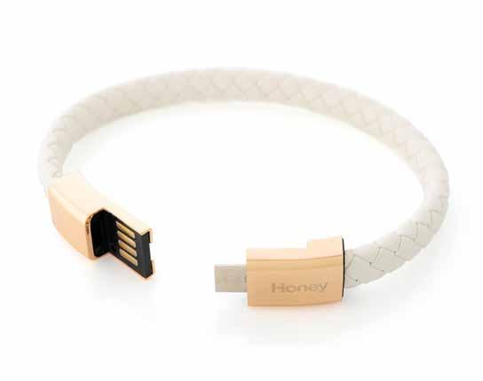 Micro-USB to USB bracelet style charging cable. White braided PU. Rose gold plated hardware. Closes 21cm non-adjustable.