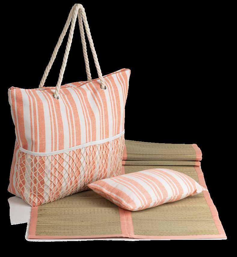 Coral and white striped cotton polyester beach bag. Nylon zip closure. Fully lined. Inner side pocket. Two outer elasticated net pockets. Matching mini pillow. Woven grass beach mat with coral trim.