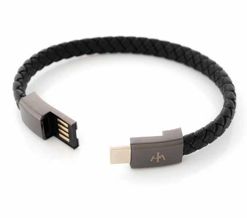 Micro-USB to USB bracelet style charging cable. Black braided PU. Gunmetal plated hardware. Closes 21cm non-adjustable.