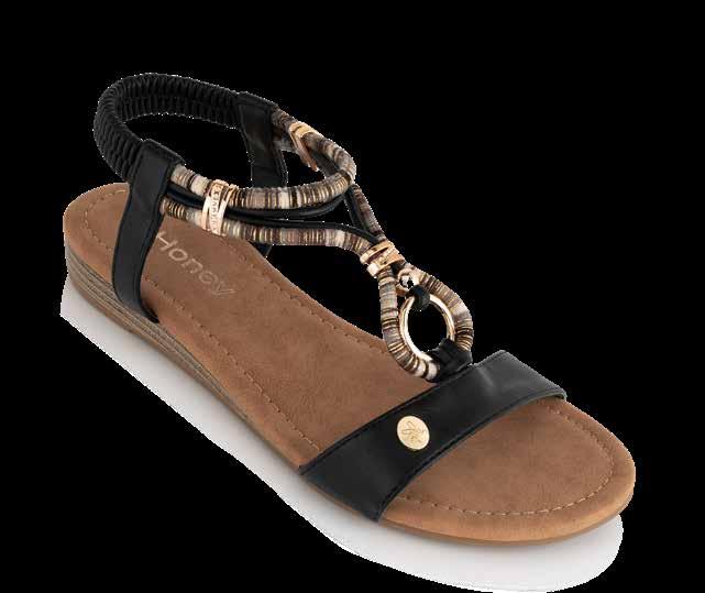 Black PU sandal. Grey and brown tonal chord detail. Rose gold synthetic beads. Elasticated PU ankle strap. Heel height: 20mm