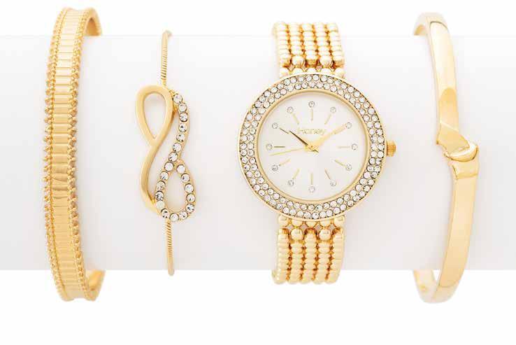 4 piece ladies set. Gold plated bracelet style analogue watch. Clear glass crystal detail. Silver sunray dial. Gold hands. Closes 19cm.