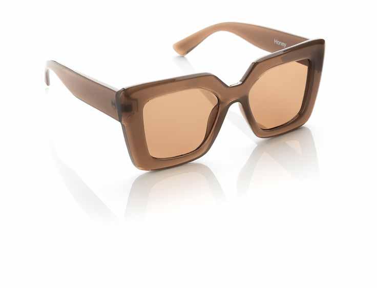 Transparent slate brown polycarbonate frame. Matching temples and tips. Solid brown lense. Protective hard case. 145mm wide.
