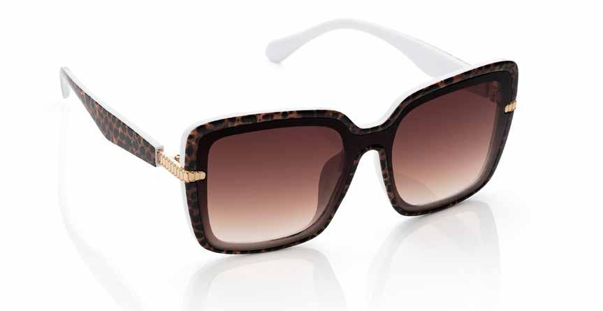 White polycarbonate frame. Brown and black animal print detail. Gold plated hardware. Matching polycarbonate temples and tips. Protective hard case. 145mm wide.
