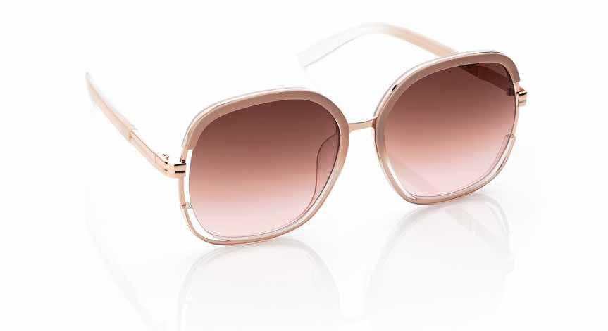Rose gold plated metal frame. Transparent and beige polycarbonate detail. Rose gold plated temples. Matching polycarbonate tips. Brown gradient lenses. Protective hard case. 145mm wide.