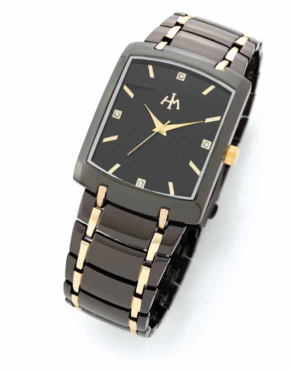 Two toned gold and gunmetal plated bangle style analogue watch. Matt black laser-etched dial with clear glass crystal detail. Gold plated hands. Push clasp closure.