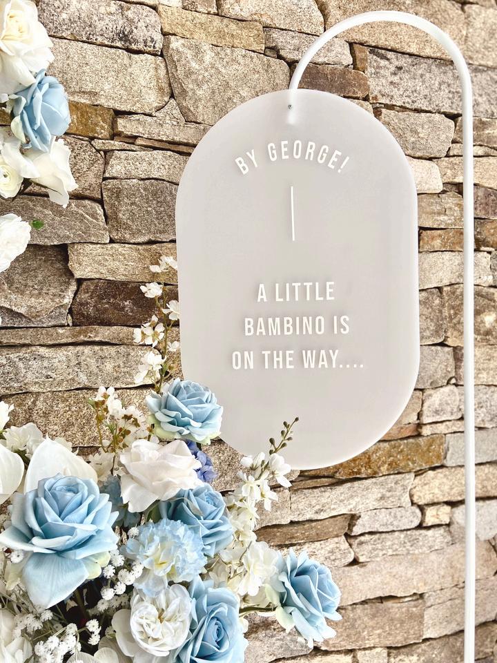 Double Arch Acrylic sign with custom acrylic wording + white metal stand