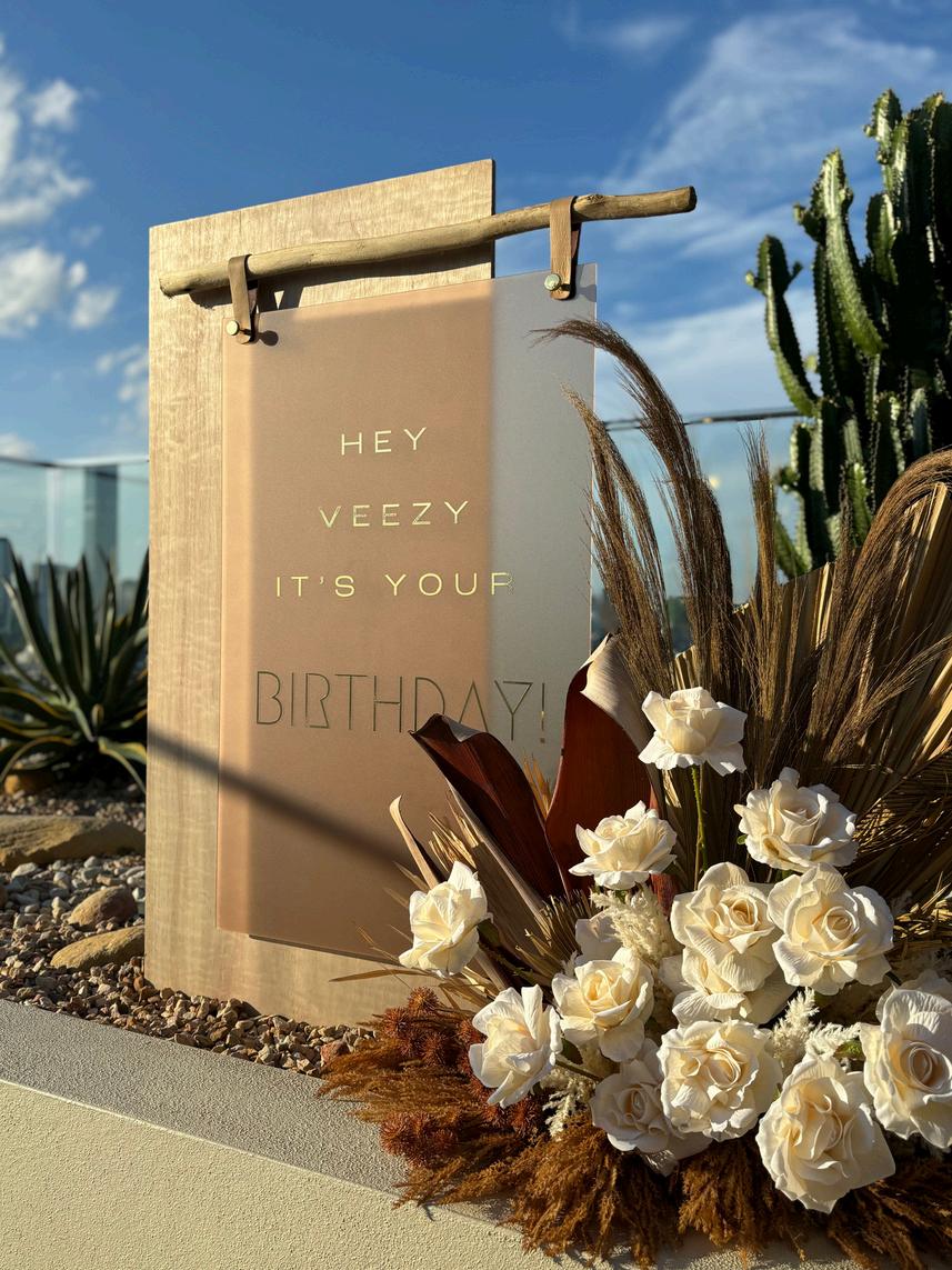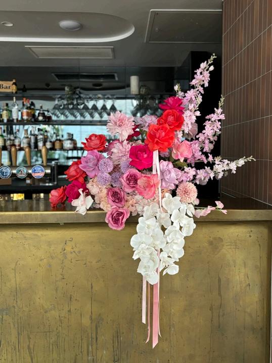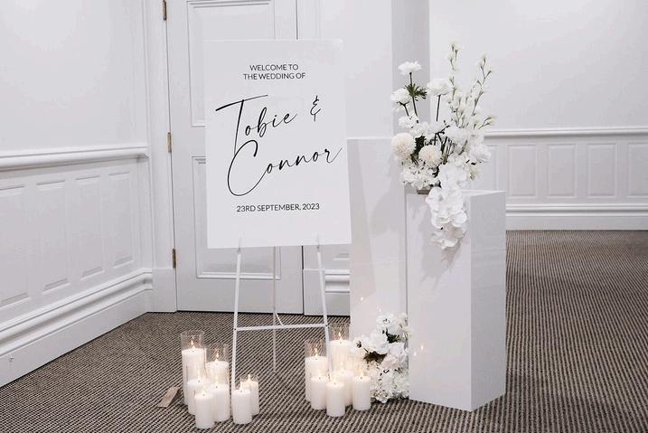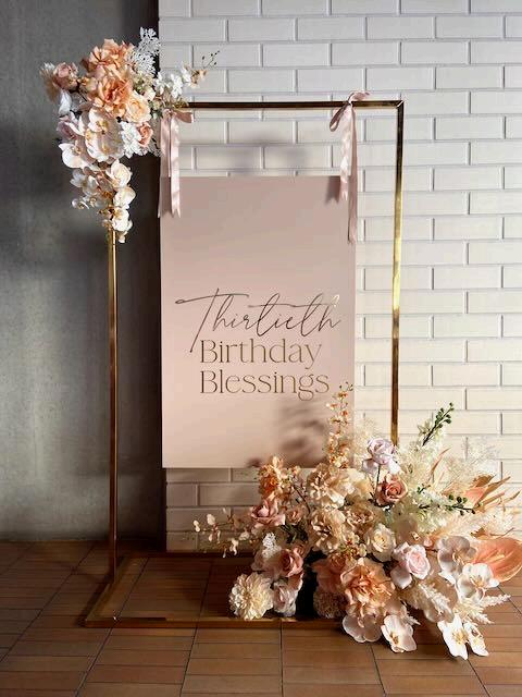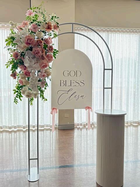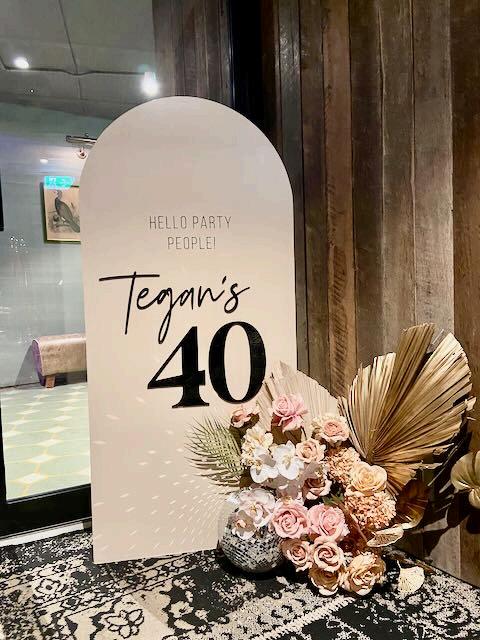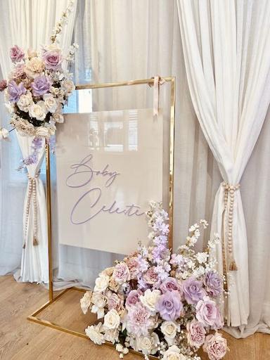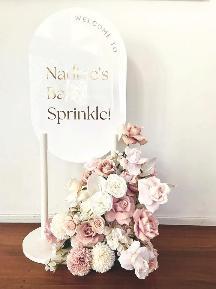 Acrylic sign with custom wording and silk floral arrangement hire