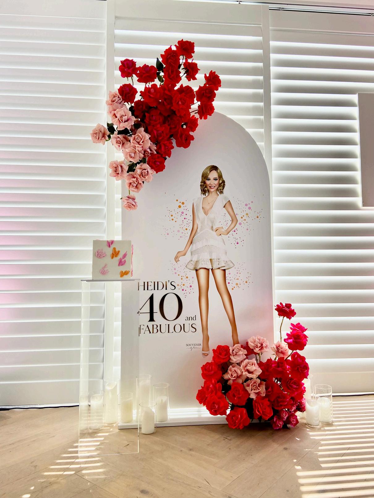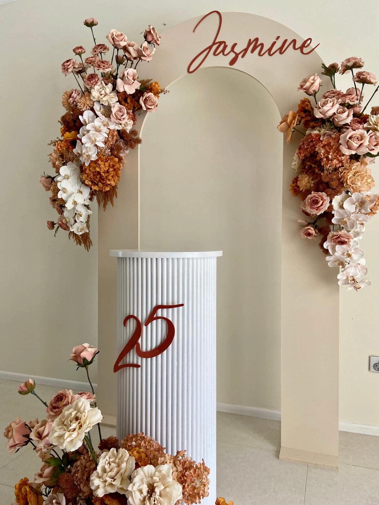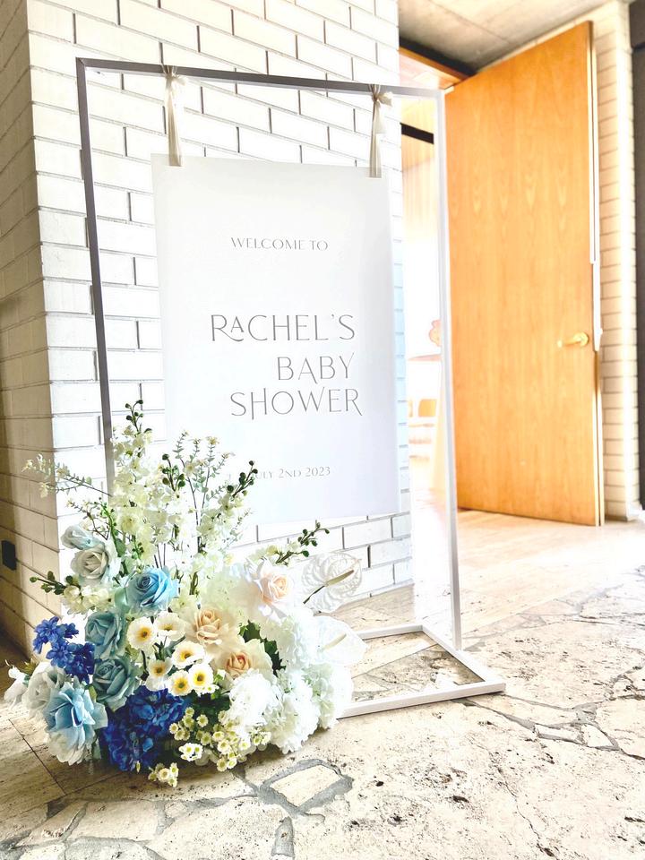 Acrylic sign with custom wording and silk floral arrangement hire