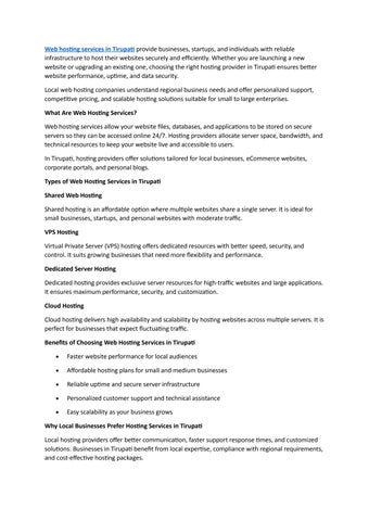 Web Development Services in Tirupati play a crucial role in helping businesses grow digitally. By choosing reliable and experienced web developers, you can create a high-quality website that attracts visitors, builds trust, and drives business success. If you are looking to enhance your online presence, investing in professional web development is the right step forward.