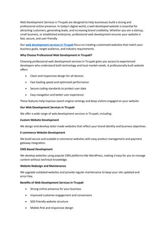Web Development Services in Tirupati are designed to help businesses build a strong and professional online presence. In today’s digital world, a well-developed website is essential for attracting customers, generating leads, and increasing brand credibility. Whether you are a startup, small business, or established enterprise, professional web development ensures your website is fast, secure, and user-friendly.