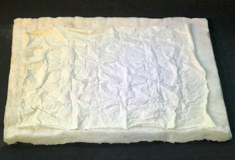 Coated with lacquer, the tissue paper is tender and tenacious like skin. In the flow of time and air, lacquer and tissue paper dried and oxidised under the right temperature and time, turning the ivory colour into a shade of dark brown. Deeply bonded with the linen cloth, it seems to be like a piece of shroud. When you come closer, the delicate texture and the fibre of the linen can be vaguely seen, reminding you a cocoon or a shell of cicada.