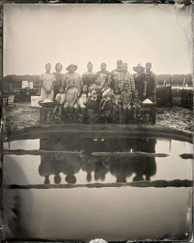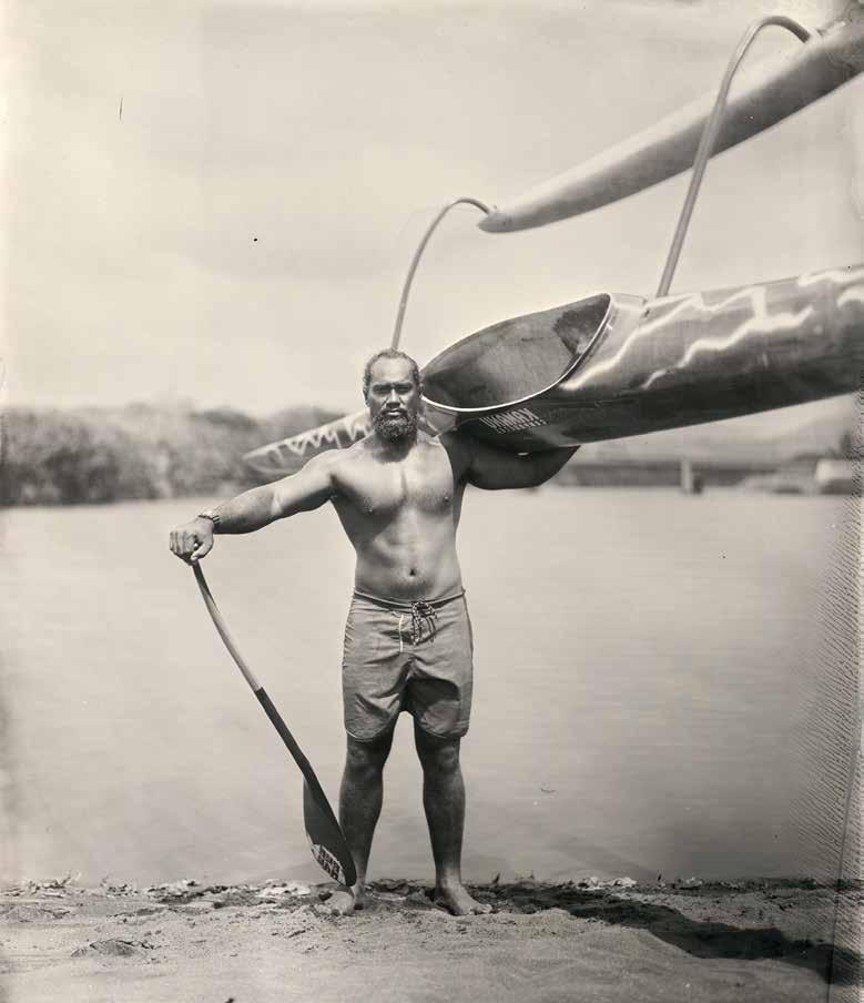 HAWAI‘I-BASED ARTIST Kenyatta Kelechi (b. 1990) uses the 19th-century technique of wet-plate collodion photography to examine concepts of Indigenous identity and connection to family and place. The blackand-white prints and glass and aluminum plates in Laulima document and celebrate Kānaka ‘Ōiwi (Native Hawaiian) cultural practitioners of today and their enduring respect and care for the ‘āina (land).