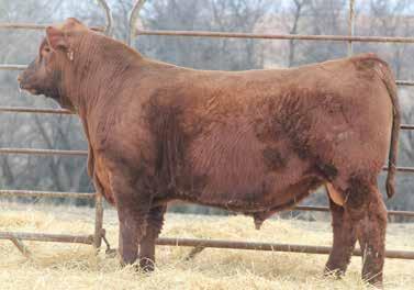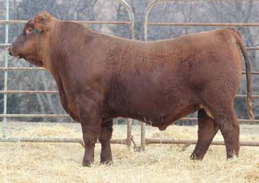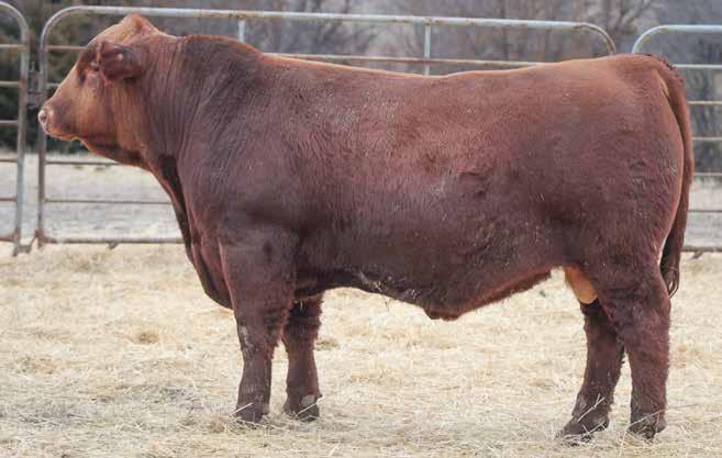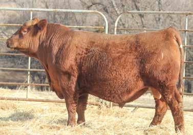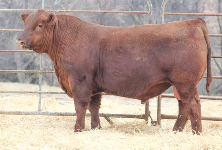 Mojo is a special bull that has stood out among his peers for his whole life. Loads of muscle and masculinity in an ideal dark red coat color. He is great-footed, bigscrotalled, docile, and free moving in a long-spined, level-topped, and attractive package, all while packing plenty of performance. Impressive from every angle with spring of rib, crest, a big hip, and an attractive small head. We will be using him back in our program immediately, including on heifers. This might be the best bull to ever come through our program.