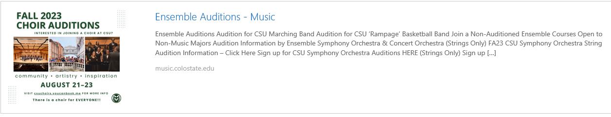 Ensemble Auditions Audition for CSU Marching Band Audition for CSU ‘Rampage’ Basketball Band Join a Non-Auditioned Ensemble Courses Open to Non-Music Majors Audition Information by Ensemble Symphony Orchestra & Concert Orchestra (Strings Only) FA23 CSU Symphony Orchestra String Audition Information – Click Here Sign up for CSU Symphony Orchestra Auditions HERE (Strings Only)--this audition is happening THIS SUNDAY, August 20th . Check the CSU Music website for all ensemble and audition information