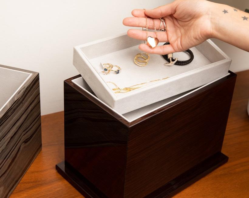 Our Taylor urn looks stunning on a table or bookshelf. The interior is lined with soft Florentine velvet and can be provided with a removable tray for you to store personal keepsakes in.