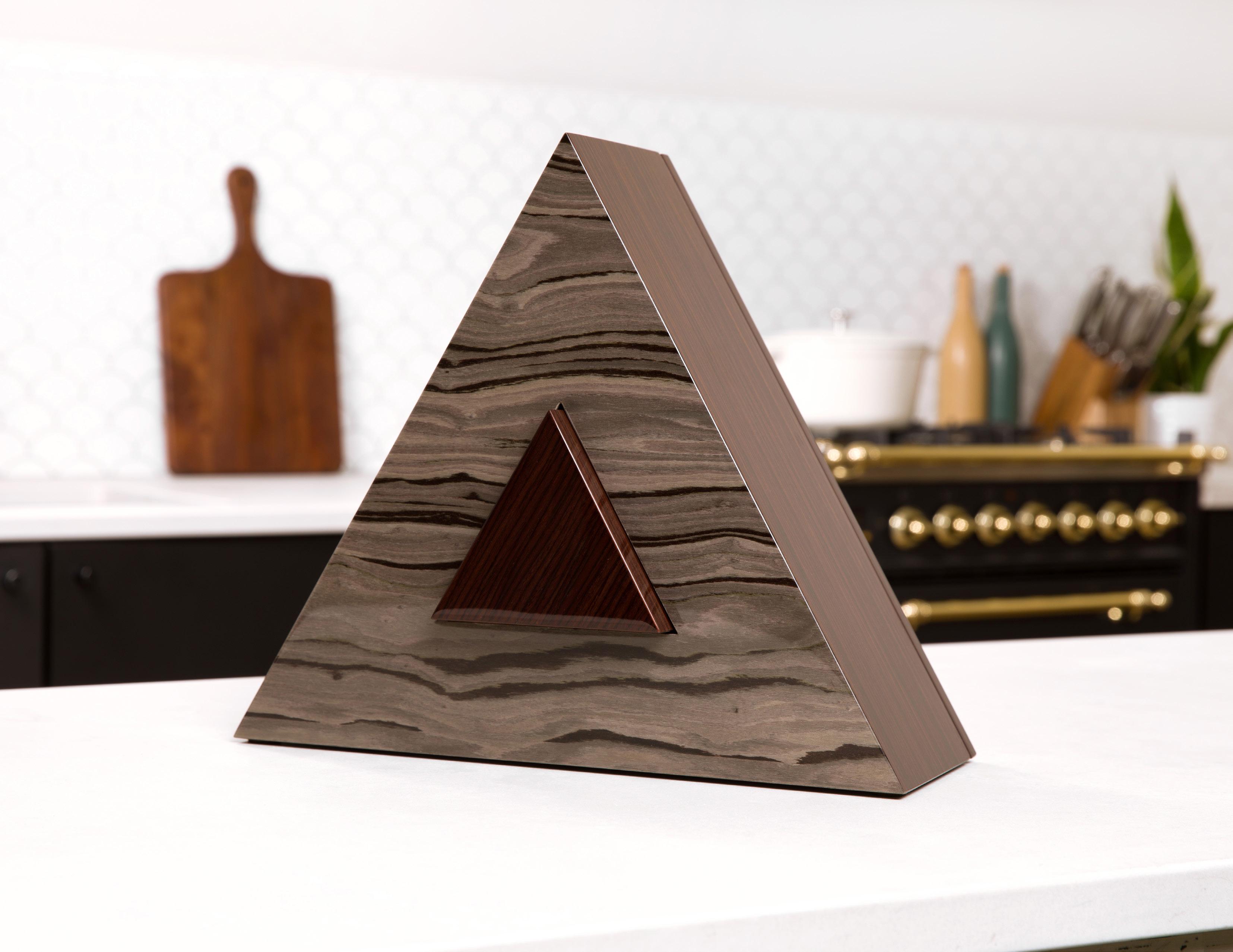 The interiors of the outside triangle are made from mahogany. A special plastic bag and ribbon is provided within the outside vessel.