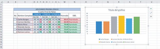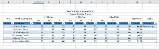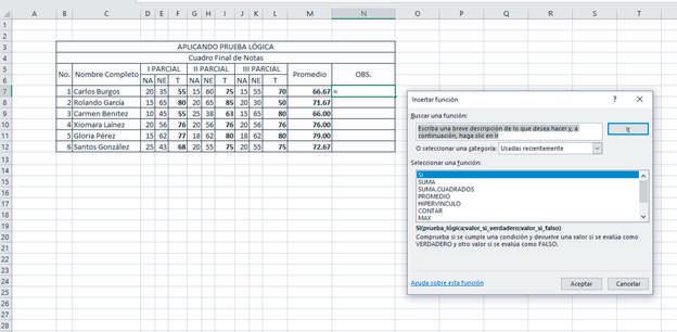 Una observación si el alumno aprobó o esta reprobado en el curso, tomando un valor de referencia de un 70% de como nota de aprobación del curso. Función a Utilizar Prueba lógica. Si