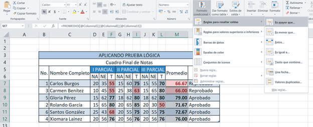 Siguiendo en nuestros datos de la prueba lógica haremos forma tos condicionales en las calificaciones con menores a 69 % serán de color rojo y mayores o iguales de 70 % color verde, al igual el texto de la columna de observaciones, Aprobado con formato de color verde y Reprobado color Rojo. Desarrollo del ejemplo. Contenido: