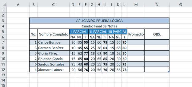 Datos de notas Prueba lógica en Libro de MS Excel. Solicitud a realizar formatos condicionados, Columnas de notas y columna de observaciones