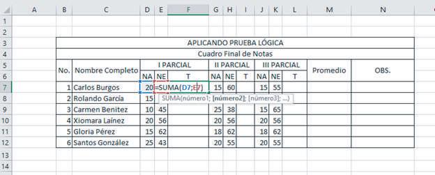 escriba la siguiente información, haga la suma total de las notas por parcial y hacer el promedio final de las notas.