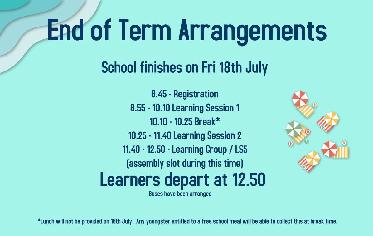 Friday 18th July is the last day of this school year, the arrangements for the day are as follows: