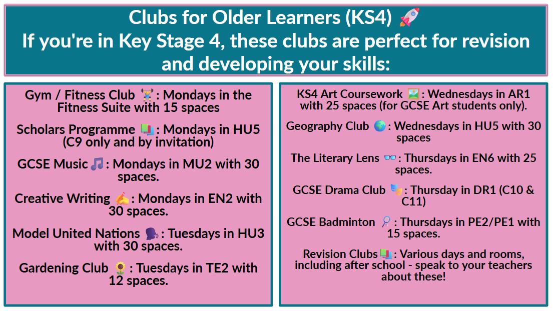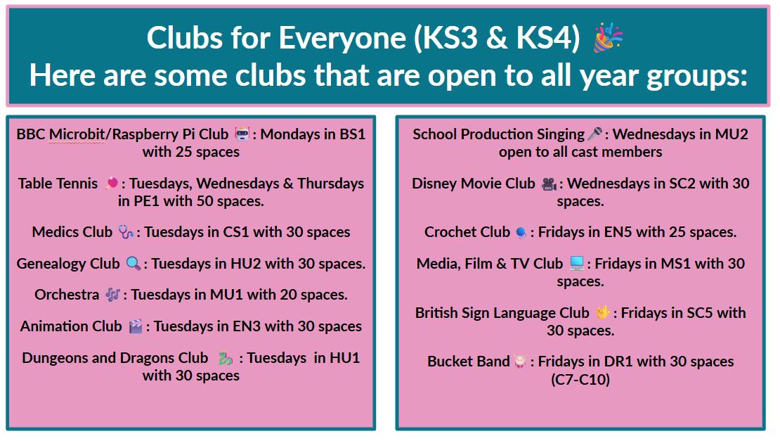 Lunchtime clubs are running! The clubs running are shown opposite - some of these are already full due to interest shown when you were all given the opportunity to complete the sign up form before half term, however if you didn't complete the form and are now interested, go the room/club on the day it is running to speak with the teachers running it so see if there is space or if you can be added to the waiting list for a space to become available.