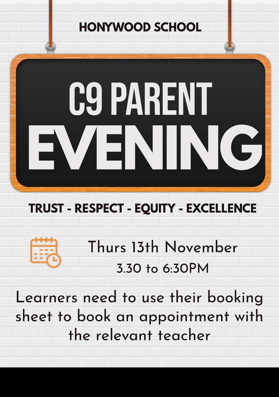 Our C9 parents evening will be taking place next week on Thursday 13th November. Learners should already have their booking sheets and may well have already booked in with a few teachers. Please let your child know when you will be available for appointments so that they may book you in with their teachers. Parents evening is a great opportunity to meet the teachers and find out about the progress learners are making. For C9 learners it is an important time to find out how they are settling into their GCSE classes. C9 is certainly one of my favourite year groups to teach and I am looking forward to an opportunity to engage with families and celebrate the learning of my class.