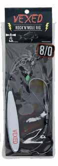 The Vexed Rock’n’Mole rig is designed for anglers chasing big fish off the rocks or beaches, such as mulloway and snapper. Rigged with chemically sharpened Octopus hooks, on heavy leader, this paternoster rig is designed for easy casting and heavyduty applications. Vexed has incorporated a floating foam above the hooks to keep the bait clear of snags and less desirable species. Available in sizes 4/0,5/0,6/0,7/0 and 8/0.